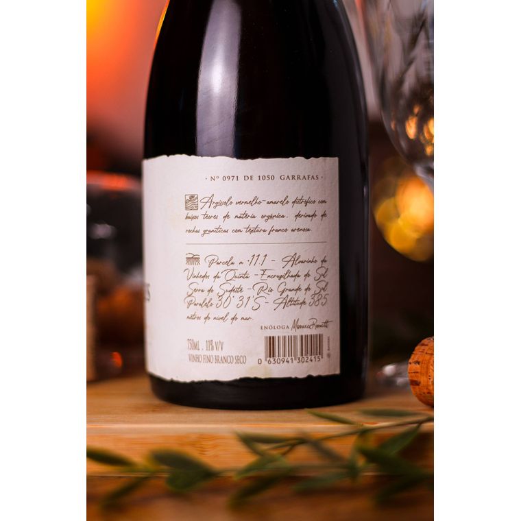 NOTAS DE PROVA: Possui uma coloração amarelo palha, límpida e brilhante. Seu paladar é refrescante e agradável possuindo uma acidez vibrante e bem integrada. Com aromas de frutas cítricas como limão e casca de laranja, frutas tropicais como abacaxi fresco, nespera e damasco e delicados toques florais como flor de laranjeira e flores brancas.